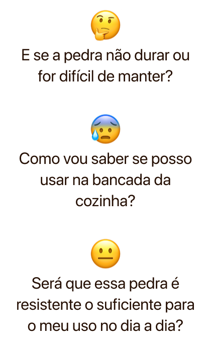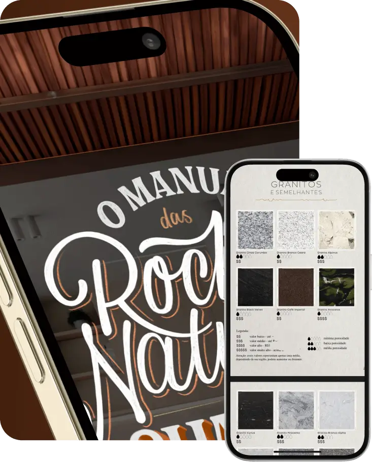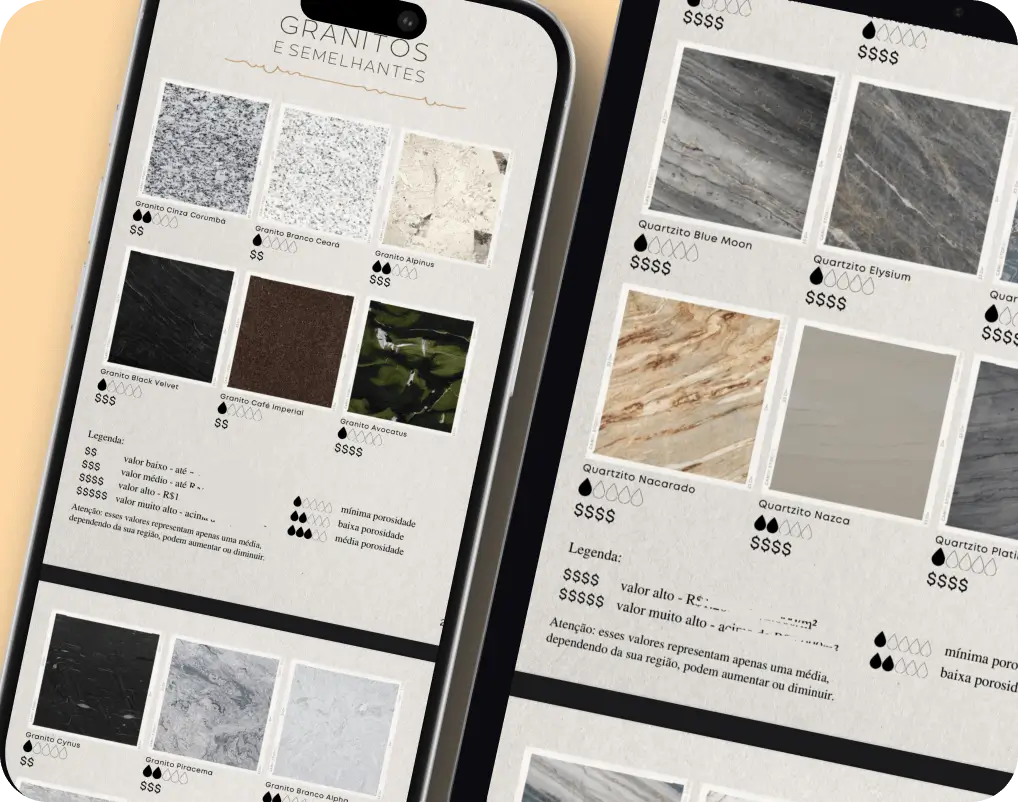 Algumas pedras mancham com mais facilidade, outras exigem menos manutenção. Você vai visualizar tudo isso lado a lado, com informações claras, para tomar uma decisão segura e inteligente — sem surpresas depois.