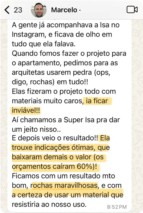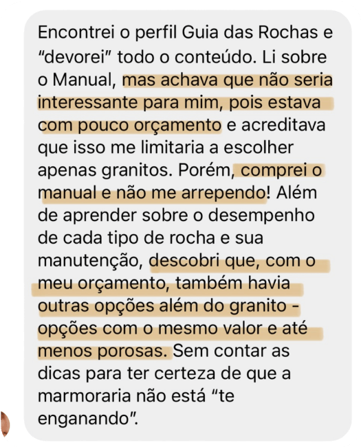 Eu sou arquiteta e criei o método do manual após atender centenas de clientes finais e saber exatamente quais eram as suas principais dificuldades e, agora com esse material, chegou a hora de eu te ajudar na escolha das rochas para as suas casas alinhando os 3 pilares: beleza, durabilidade e orçamento.